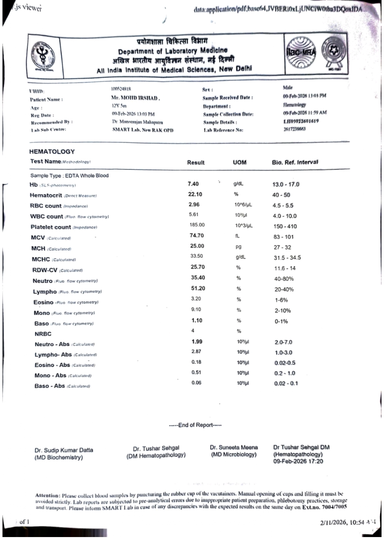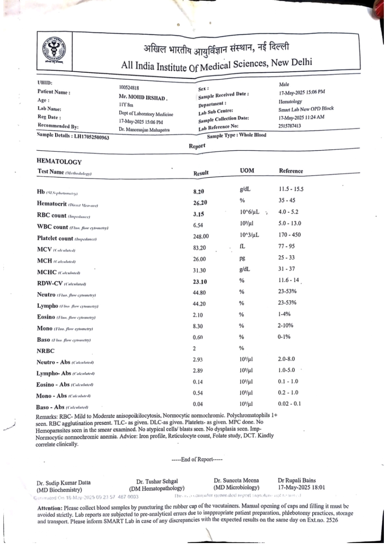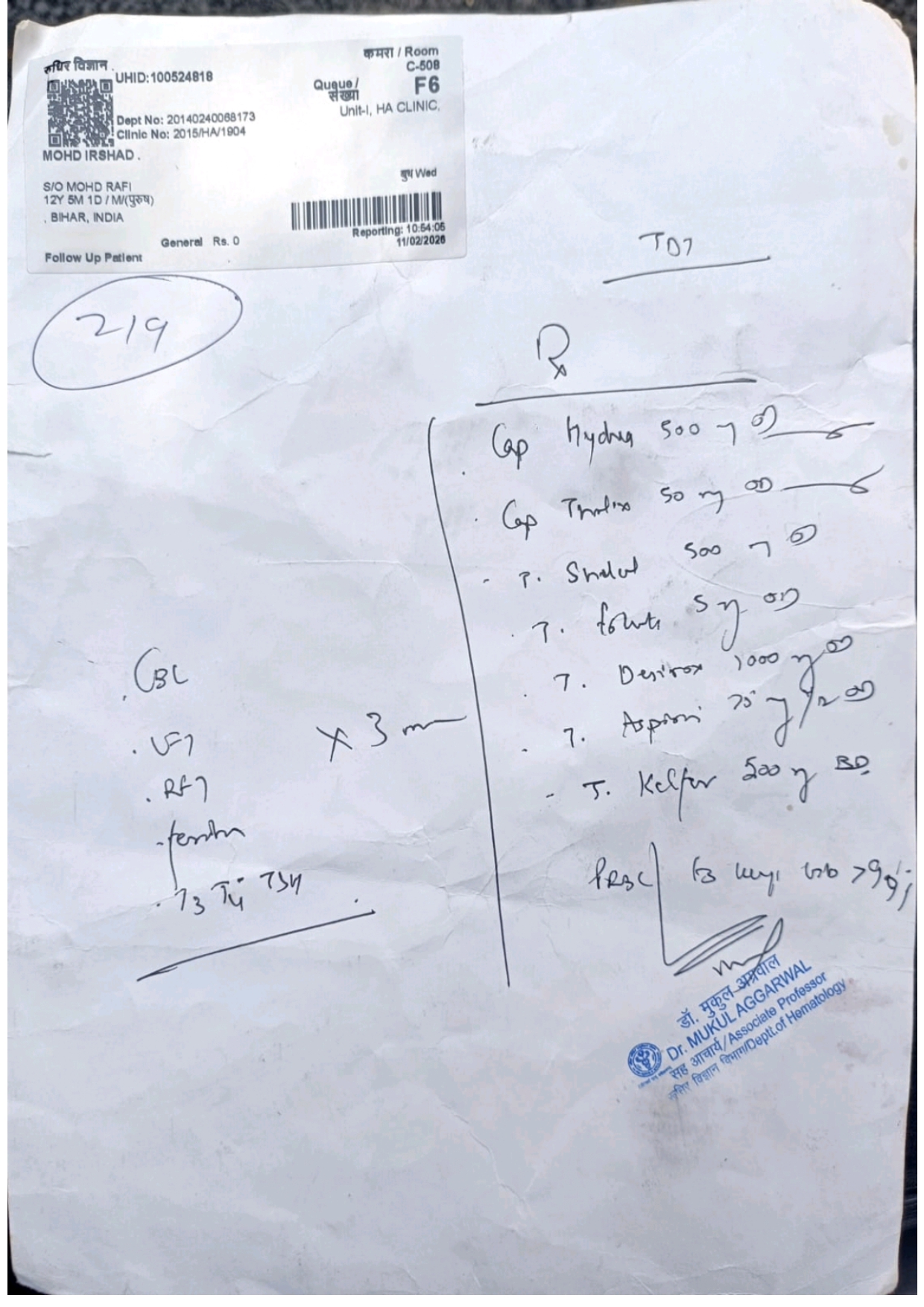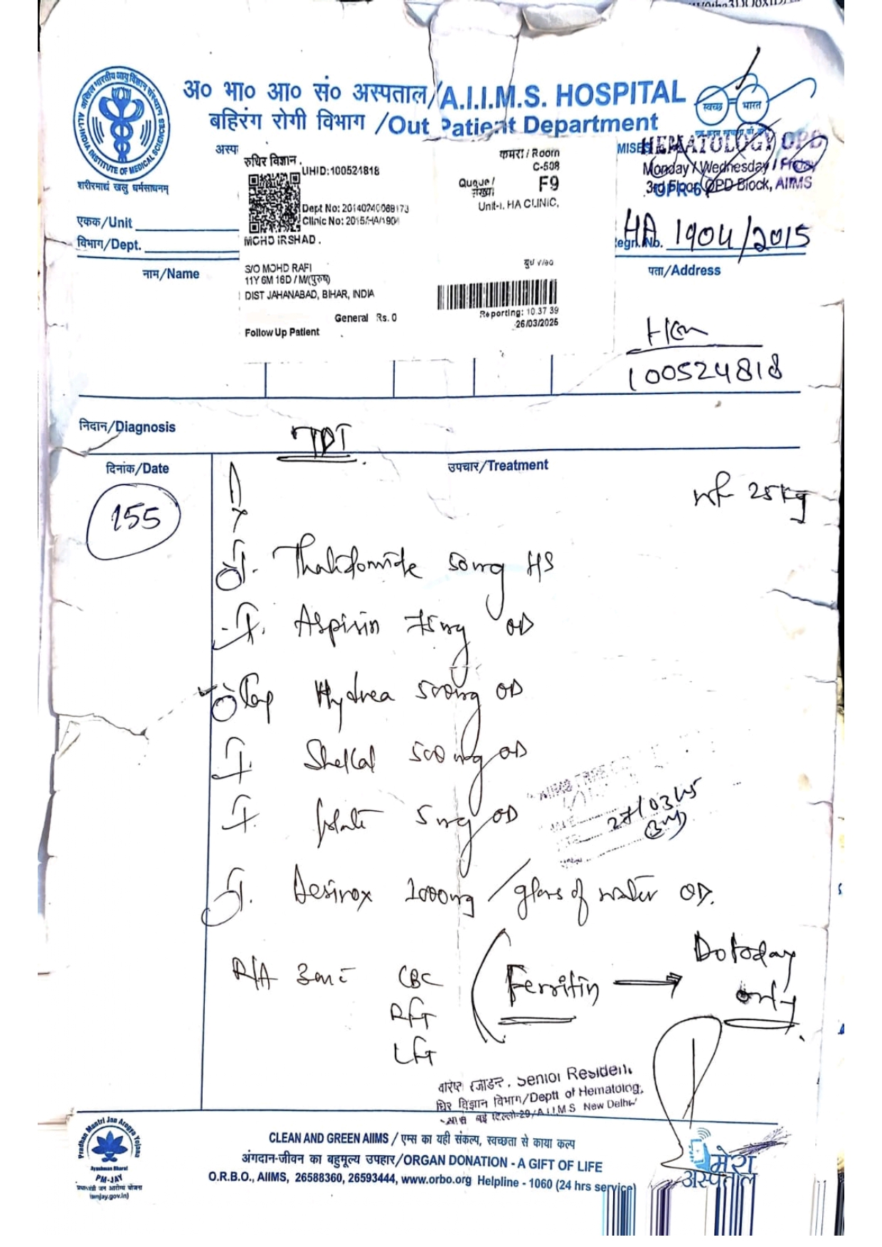 Baby MOHO IRSHAD is suffering from Thalassmia and is being treated in AIIMS Paediatric UHID: 100524818