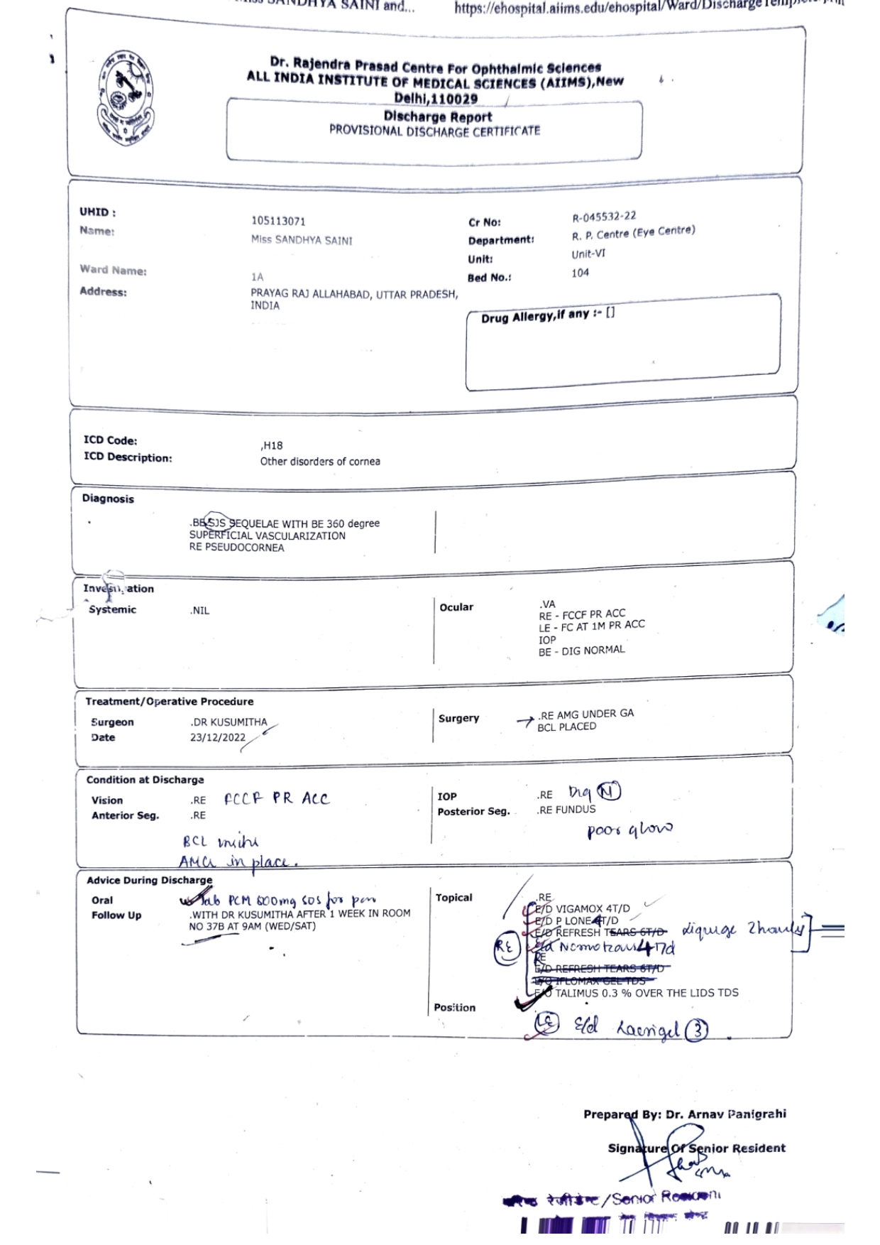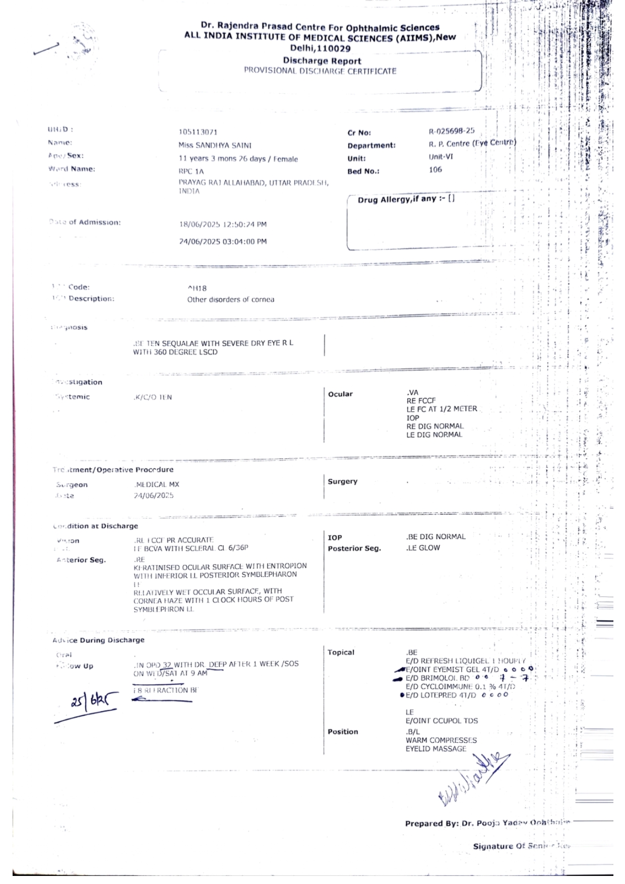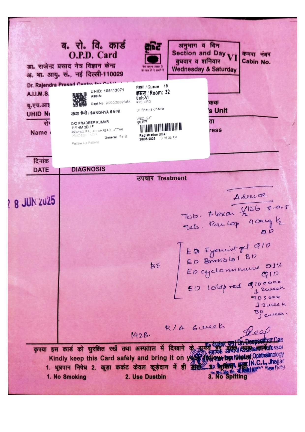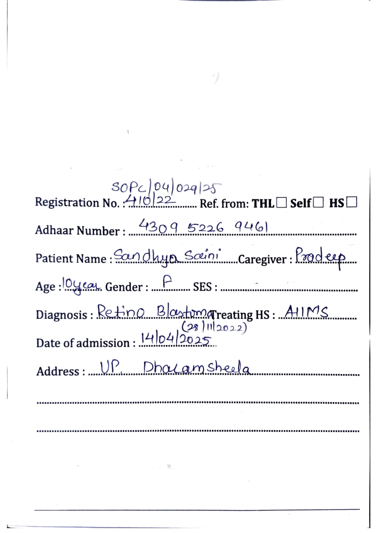 Baby Sandhya is suffering from Eye Cancer and is being treated in AIIMS Paediatric UHID: 105113071.