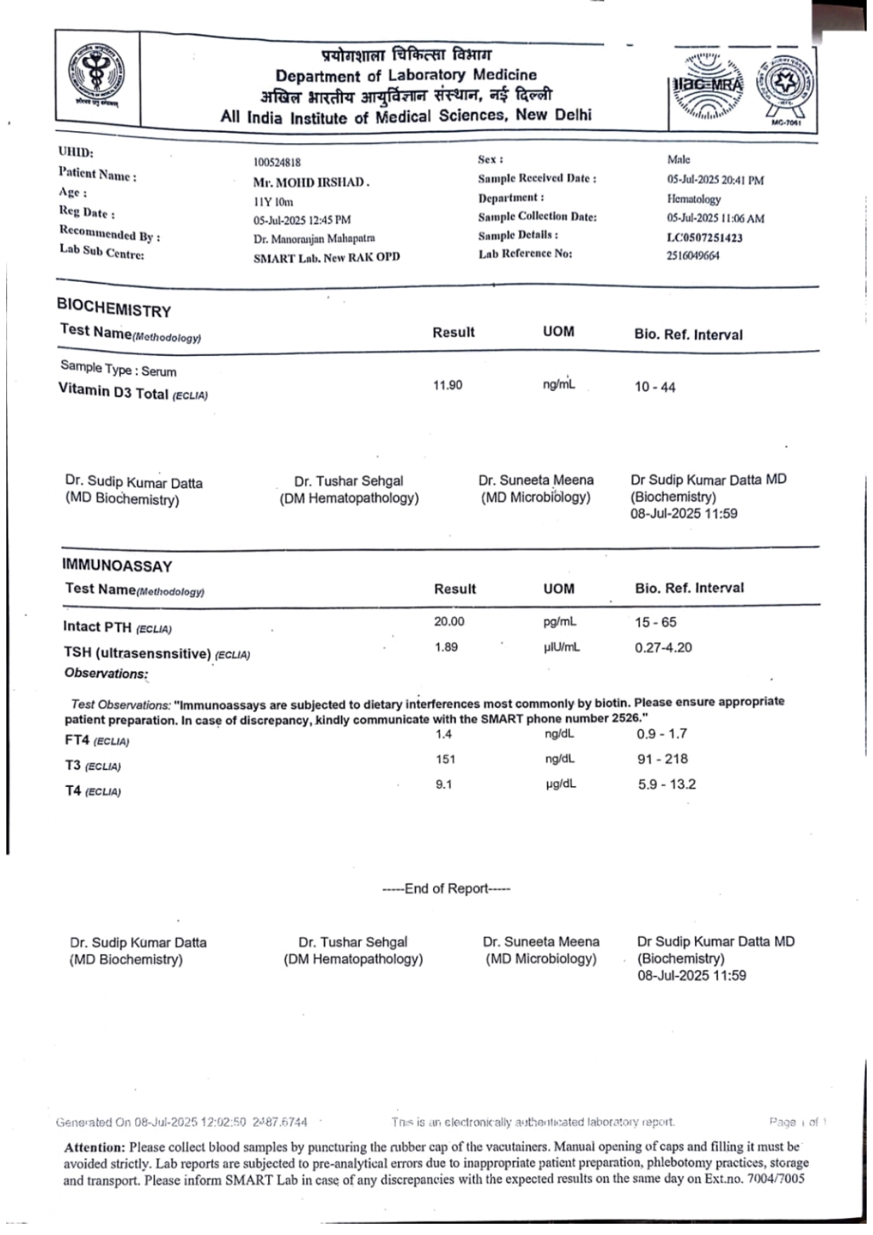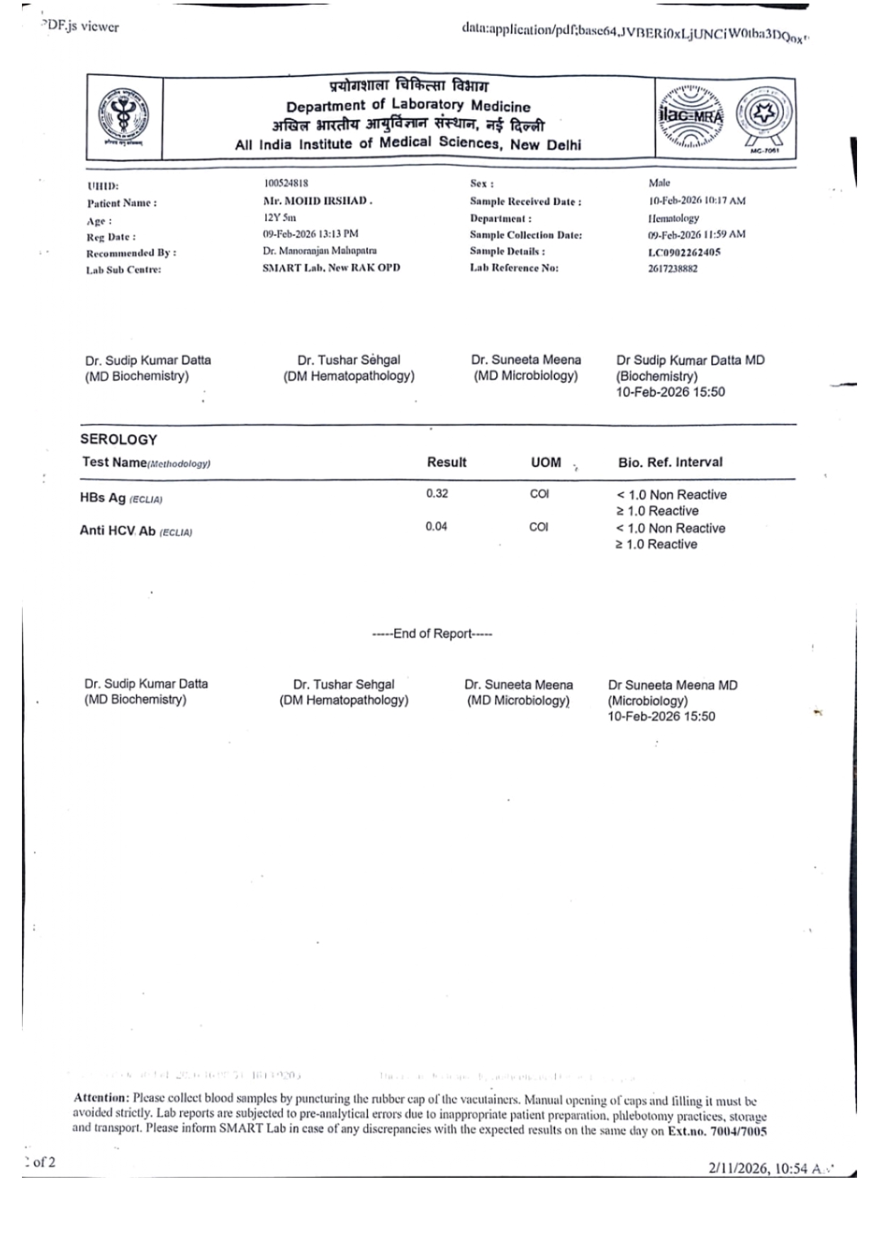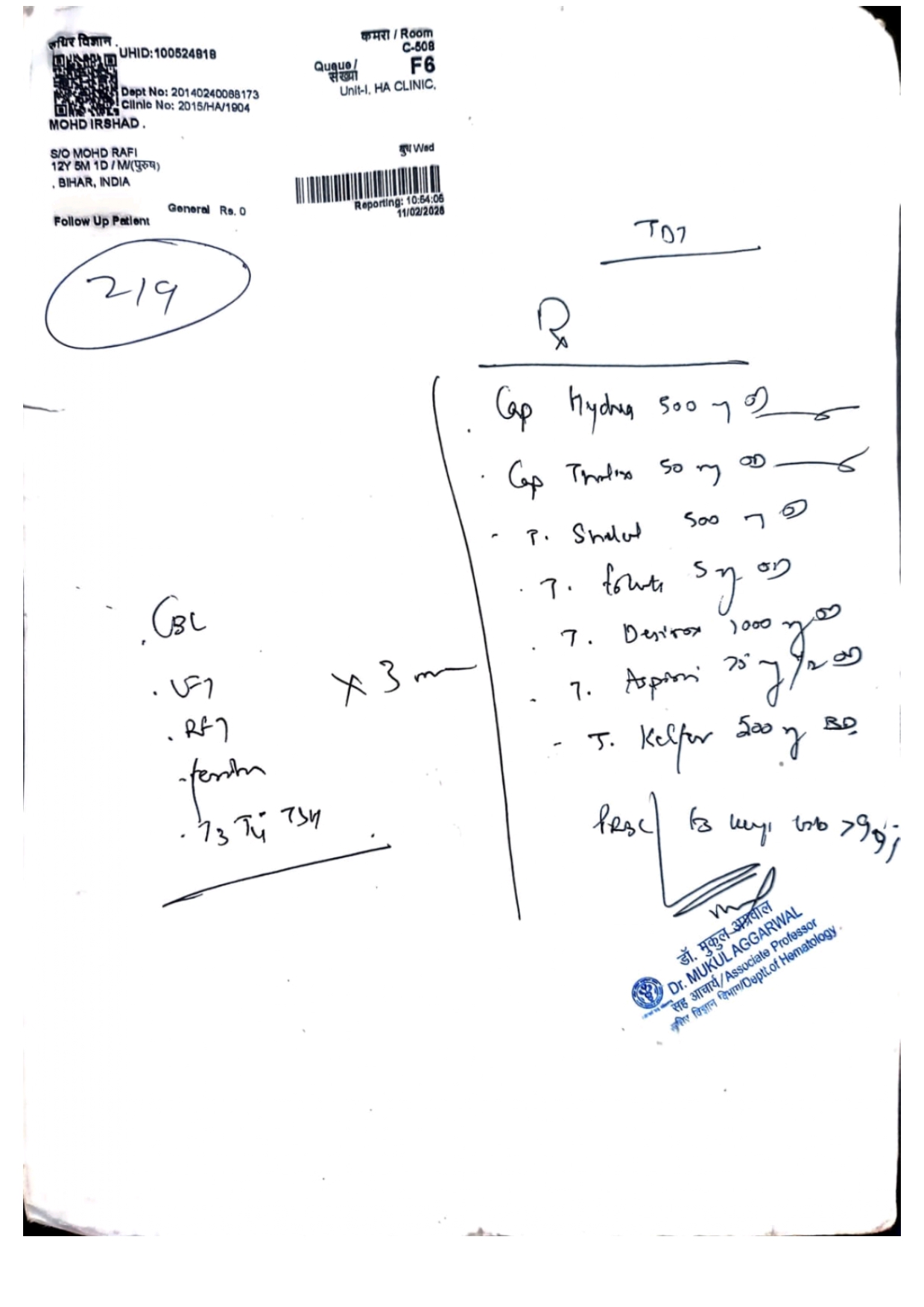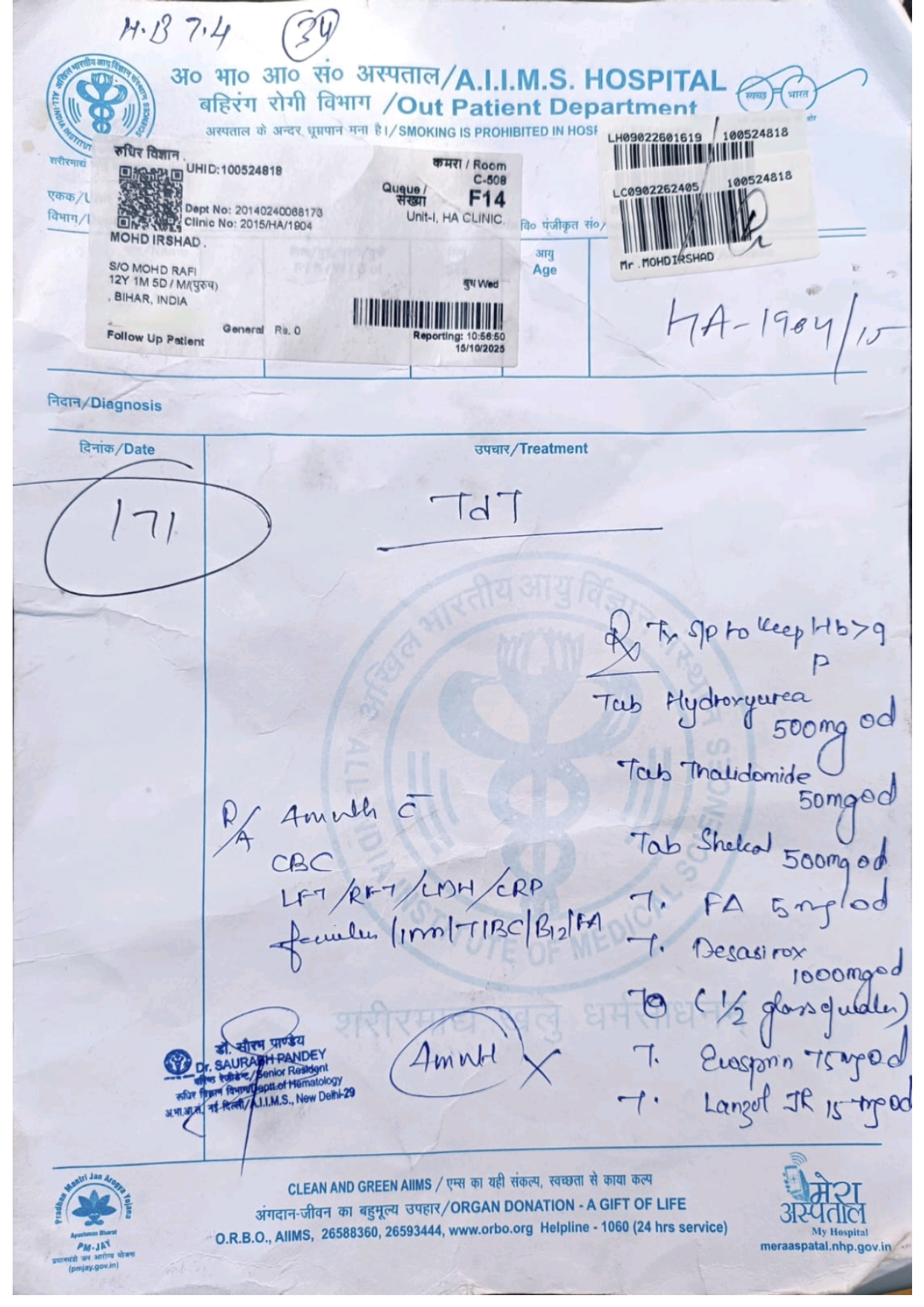 Baby MOHO IRSHAD is suffering from Thalassmia and is being treated in AIIMS Paediatric UHID: 100524818